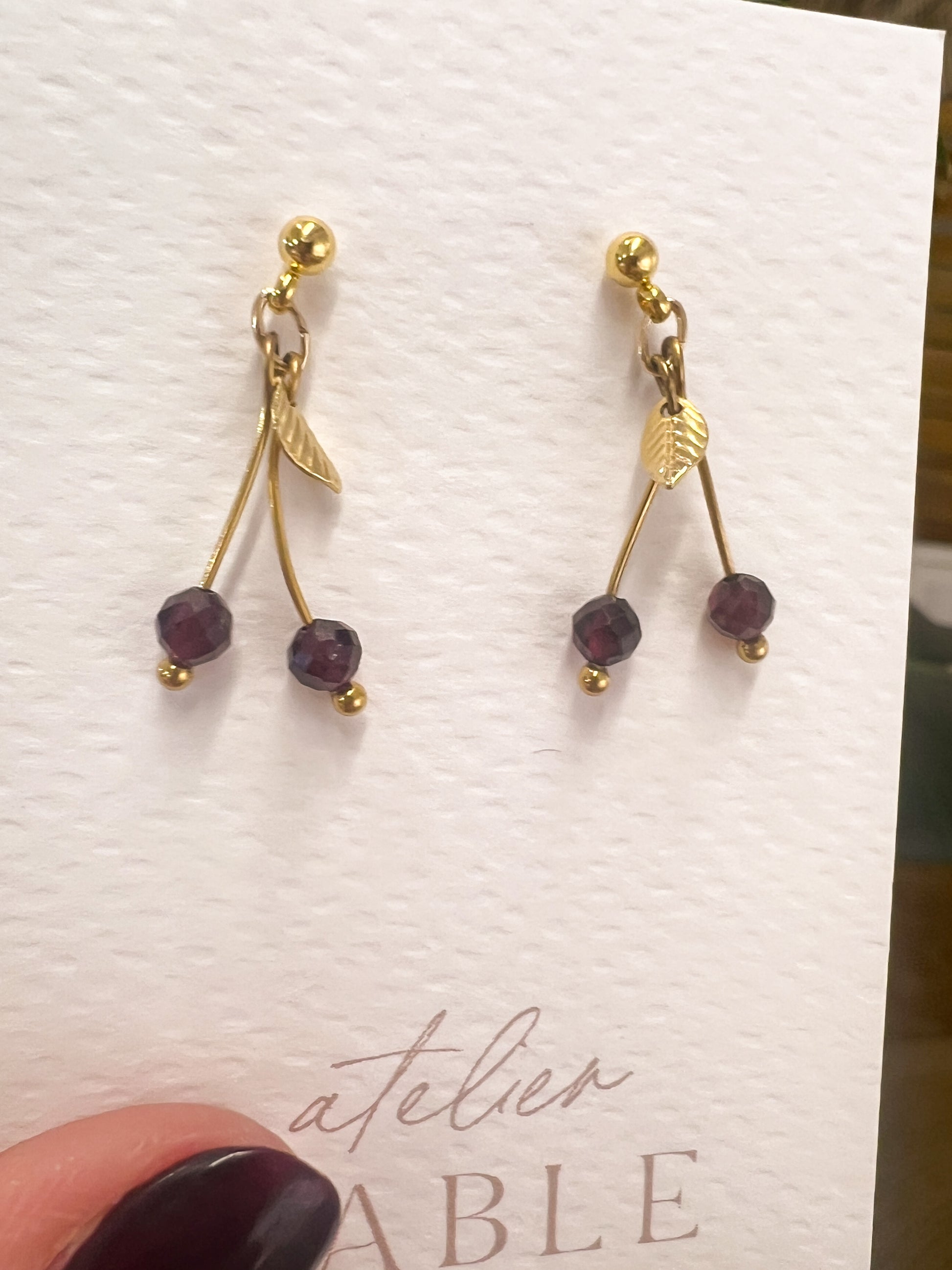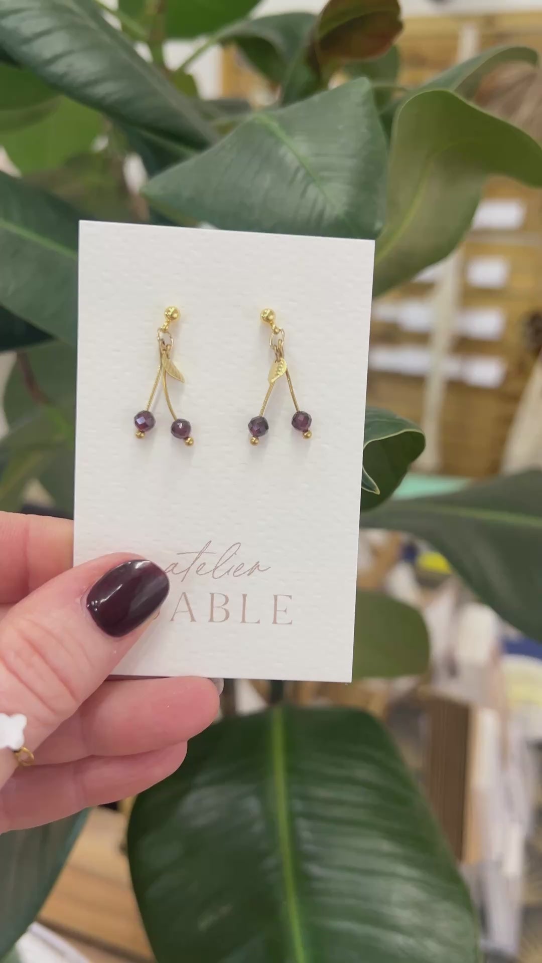 Une adorable paire de boucles d’oreilles en forme de cerises avec de précieuses perles en grenat et et des clous en inox plaqué or.